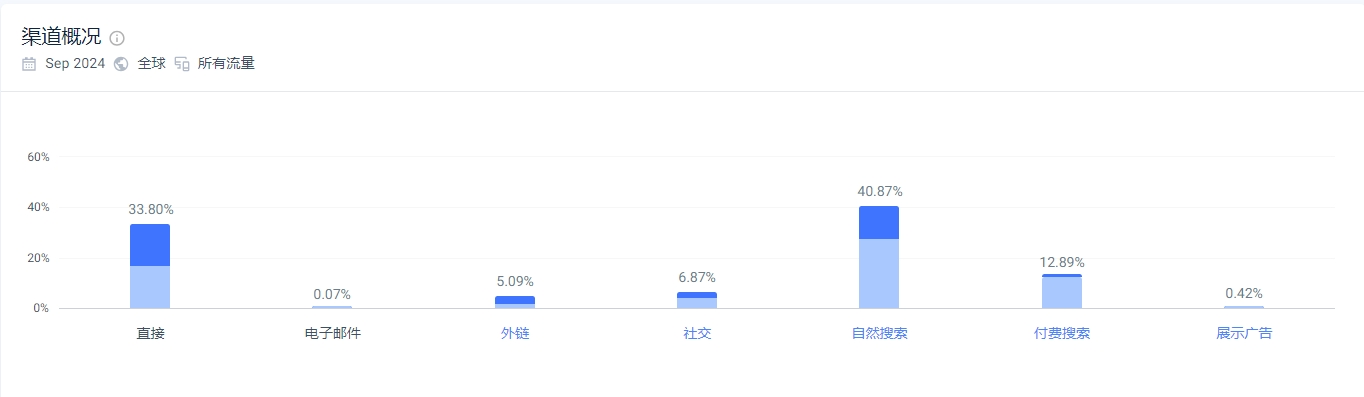 根据similarweb数据显示,Welly官网的流量主要来自于自然搜索流量(40.87%)、直接访问流量(33.8%)、付费搜索(12.89%)、社交媒体(6.87%)。
