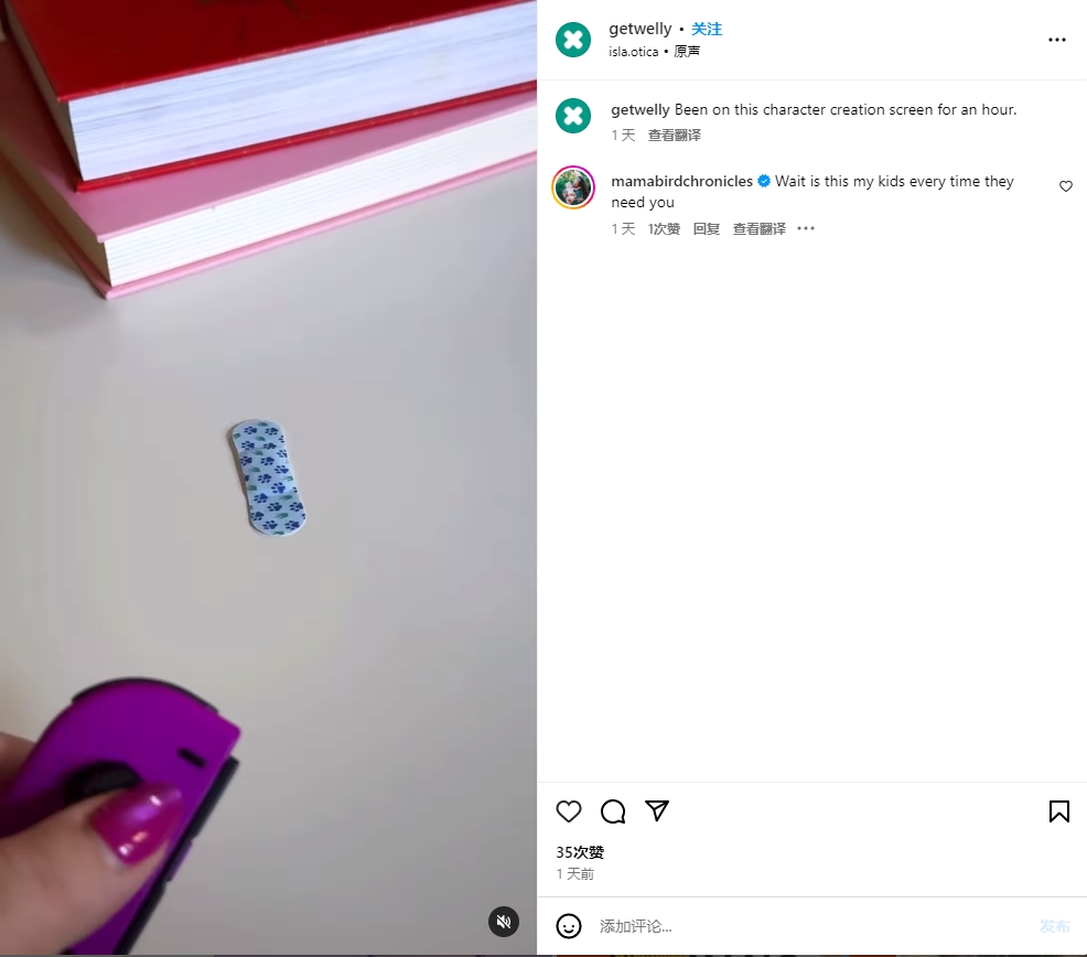 比如,其最近发布的一则视频帖,内容是用游戏手柄来搭配创可贴的快速切换,色彩鲜艳且极具动态效果的创可贴,无疑能够快速吸引平台用户的注意。此外,这一视频,不仅展现了其创可贴设计的多样性,还给人一种活泼、趣味的感觉,这是能够使其年轻化的品牌形象深入人心的。